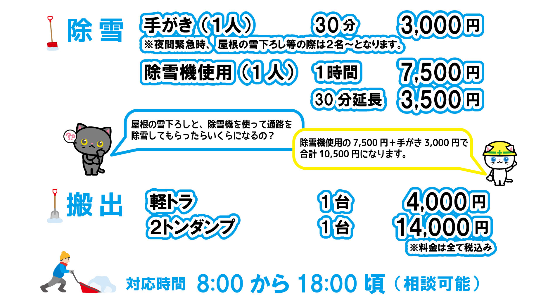 ご自宅のお庭の除雪、屋根の雪下ろしから、駐車場、店舗・オフィスの敷地まで大変な「除雪」を除雪サービスねこのて が代行いたします。